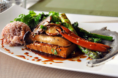 My husband ordered the tofu mushroom "steak" that included tofu marinated with spicy ginger sauce, juicy mushrooms, roasted kale, grilled veggies, lemon-tahini pesto and rice. The presentation was beautiful, and the flavours of the tofu marinate and pesto were amazing.