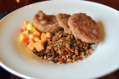 I swayed from my usual fruit-based breakfasts and ordered a dish that included cinnamon-covered apple fritters, fresh fruit, and homemade pepita and goji berry granola with vanilla bean cream. It was essentially like a granola-yogourt bowl with doughnuts! The granola was very similar to what I make at home, but it was a little too sweet for my tastebuds.